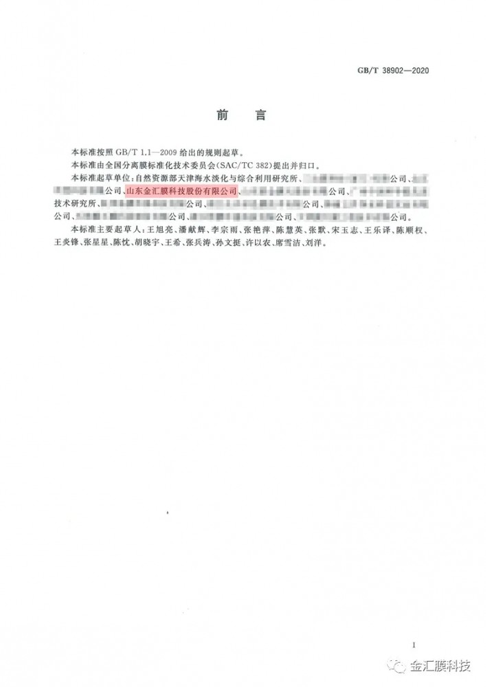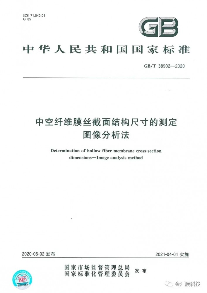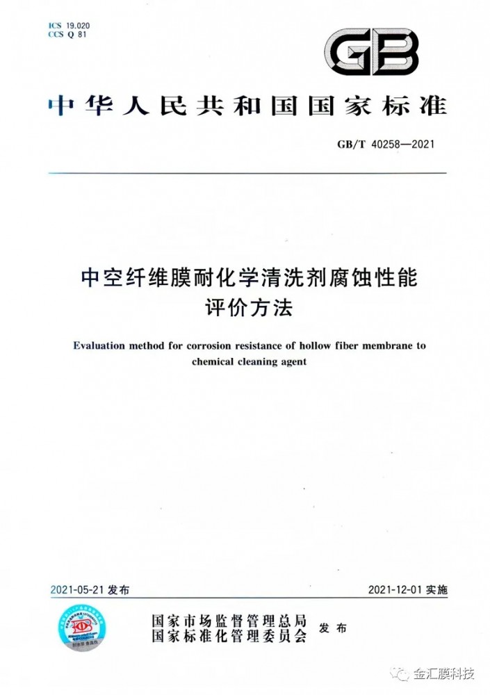 山東金匯膜科技股份有限公司參與起草編寫了國家標準:《中空纖維膜絲截面結構尺寸的測定圖像分析法》、 《中空纖維膜耐化學清洗劑腐蝕性能評價方法》2項,現已發布。